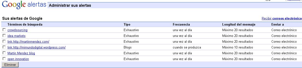 Por ejemplo, a mi me interesa conocer cualquier publicación que aparezca en la web (y que sea indexada por Google) sobre términos como: crowdsourcing, open innovation, idea markets. También me interesa estar atento a otros blogs o páginas de internet donde se haga link a este blog. Todo esto puede ser configurado como una alerta y recibirla diariamente en tu correo.