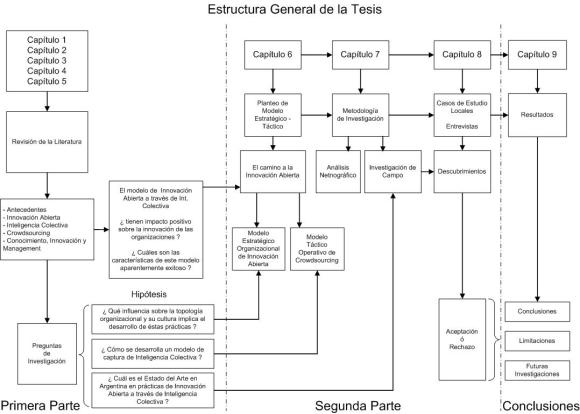 Estoy finalizando la etapa de desarrollo de los capítulo de encuadre teórico y revisión bibliográfica. La figura al pie, muestra un borrador del esquema general de la Tesis. Tengo casi finalizados los Capítulos 1-2-3-4 y 5.