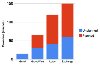 El análisis afirma que los unplanned outages que toman por sorpresa al personal de IT de las compañías son dos veces mas en soluciones Novell GroupWise y hasta cuatro veces mas en Exchange si se compara con Gmail. Para los downtimes programados, Gmail es mas confiable en cuatro veces con respecto a GroupWise y hasta 10 veces si se lo compara con Exchange.
